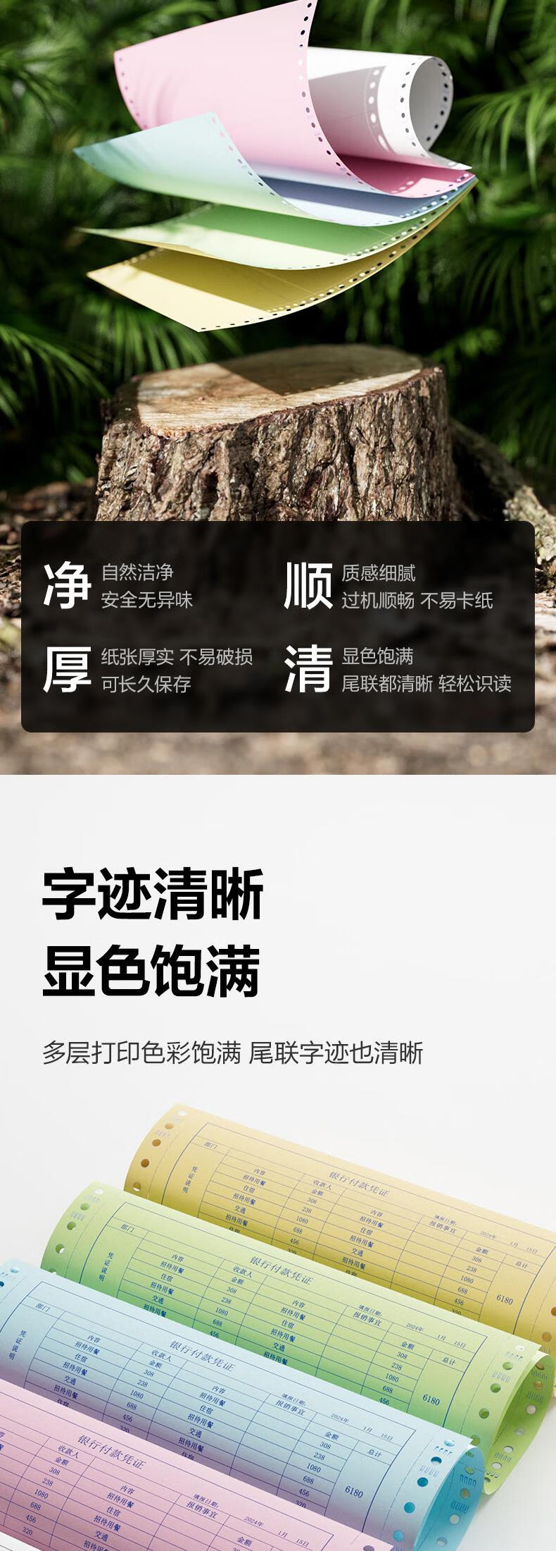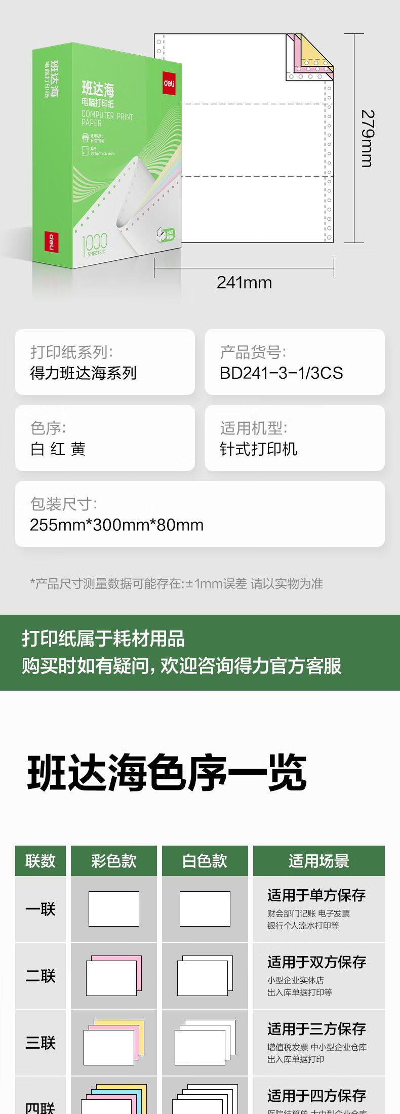 得力(deli)【缺页十倍赔】三联三等分针式打印纸 可撕边电脑打印纸 彩色(白红黄)出库送货单1000页/箱